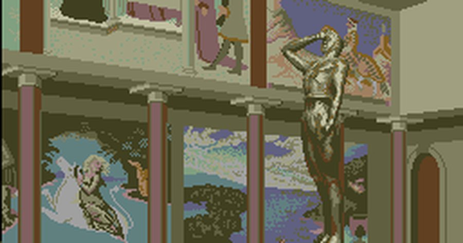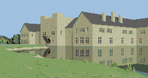 The top picture is a hand-drawn image from The Guild of Thieves, and the one below it is a photo that's been scaled down and reduced to 16 colours (including black). Actually, the photo isn't too bad, although it's considerably noisier than the drawing. Real photos also contain too much clutter to be effective at low resolutions. For example, here we would be better off without those trees (like in the drawing).